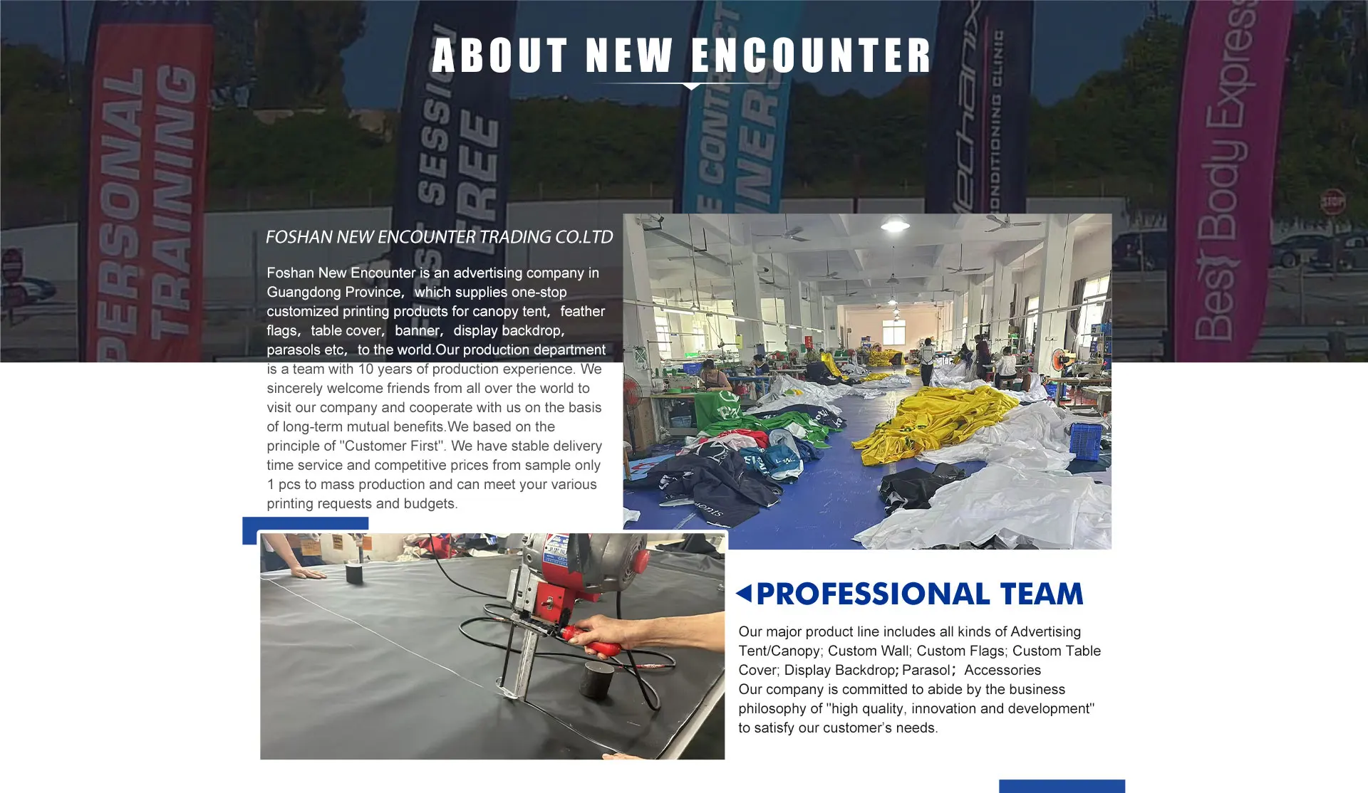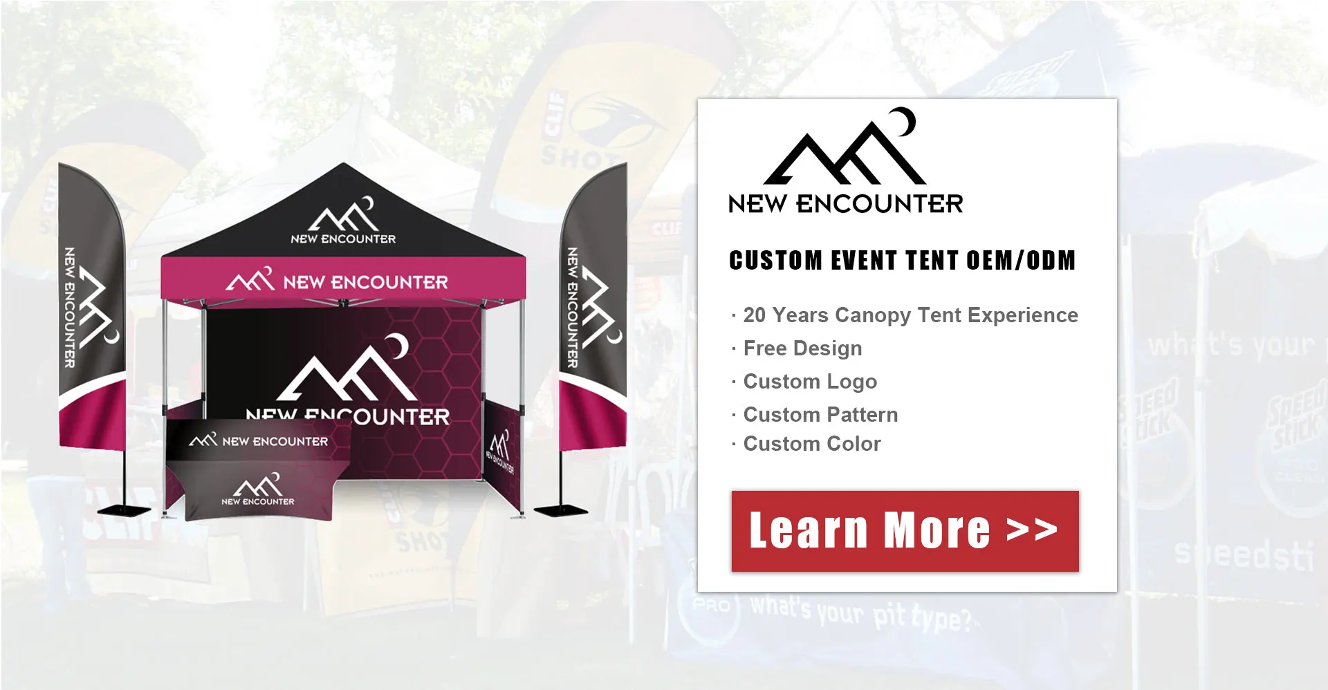 Productos principales:Tienda publicitaria, pared de pancarta, cubierta de mesa, bandera de playa, accesorio de tienda